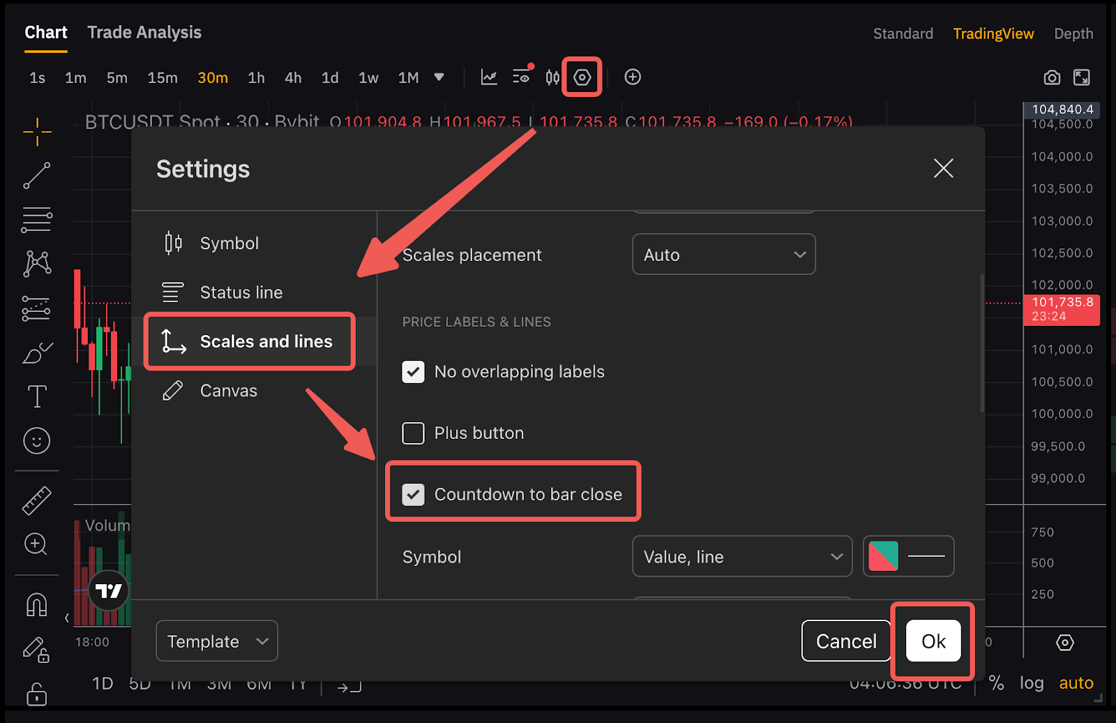 Navigate to Settings → Scales and Lines and tick on the Countdown to Bar Close box to enable it. This feature is currently only available on PC.
