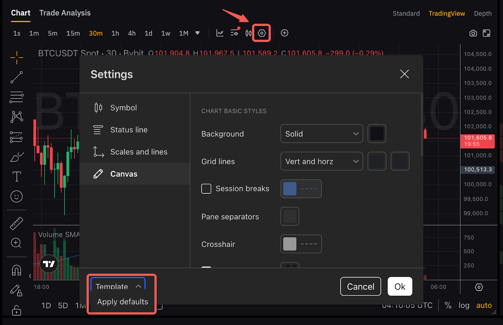 Right-click within the chart area, then click on Settings → Template → Apply Defaults. Alternatively, please clear your browser cookies and cache to reset the chart back to its default setting.
