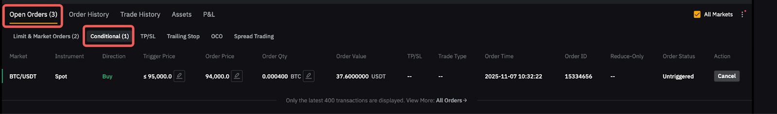 Traders can place 500 active orders, 10 conditional orders, and 20 TP/SL orders. The maximum number of active and/or conditional orders that can be viewed on your chart is limited to 100. Any subsequent orders placed (101st order onwards) will overwrite the display of the oldest order shown on the price chart.