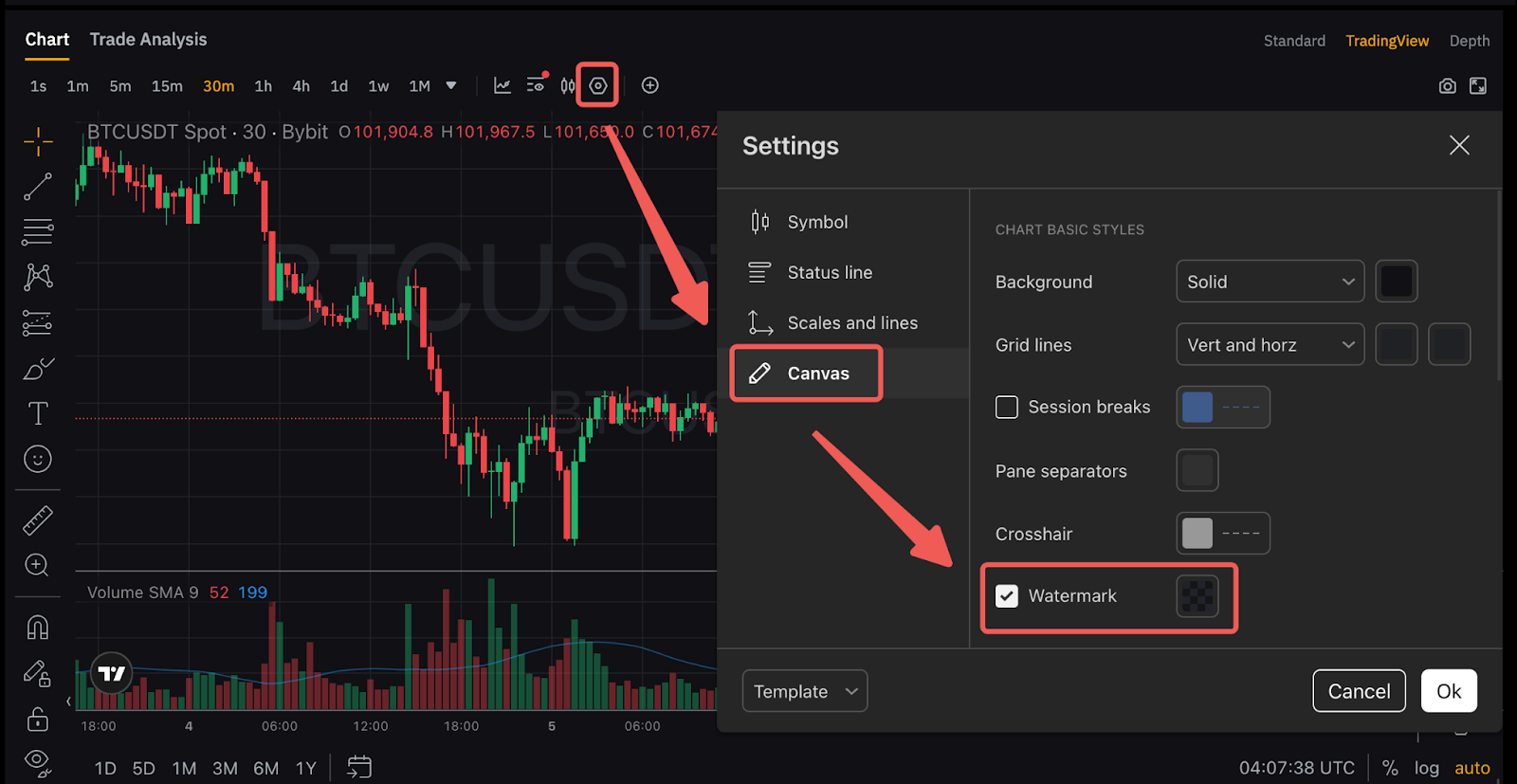Right-click within the chart area, then click on Settings → Canvas → uncheck the Watermark box and click on Ok.