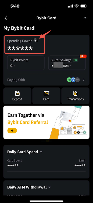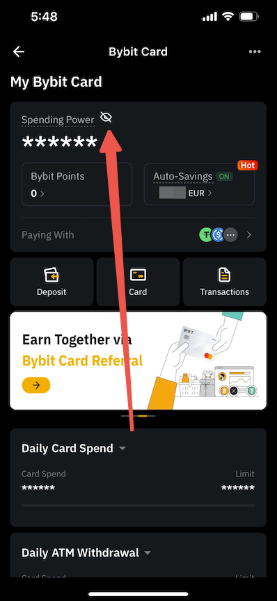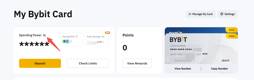 Turn on the eye icon located next to Spending Power on the Bybit Card Dashboard.
