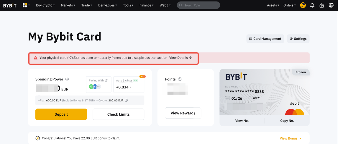 3. Freeze your Bybit Card when you are not using it (you can use it immediately upon unfreezing).