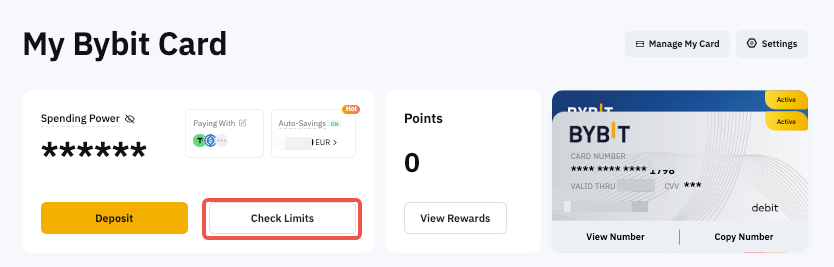 Click on Check Limits on Bybit Card Dashboard and select if you want to check the card, ATM limit