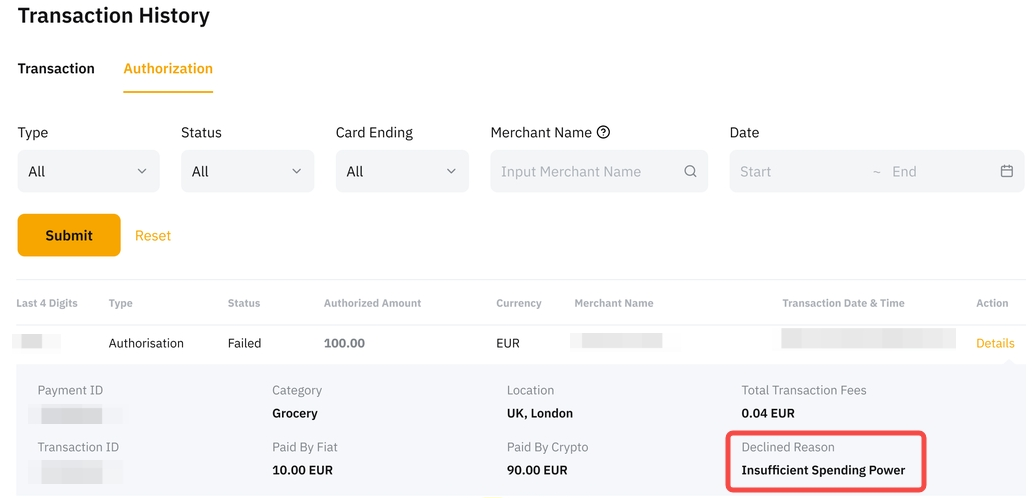 To check the declined reason, go to your Bybit Card Transaction HistoryAuthorizationDetails of the respective transaction.