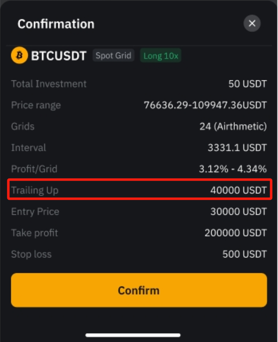 Step 4: In the Confirmation popup, review all your settings, including the Trailing Up option, and tap Confirm.