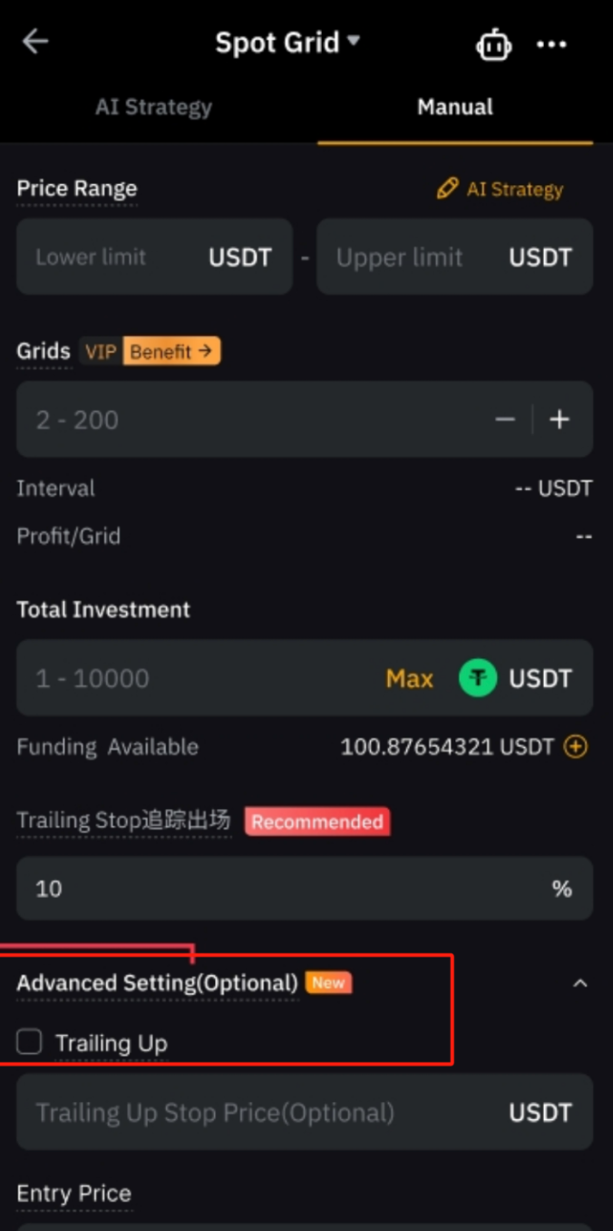 Step 2: Choose either the AI Strategy or Manual tab. In Advanced Settings (Optional), check the Trailing Up box and set a trailing up limit price if needed.