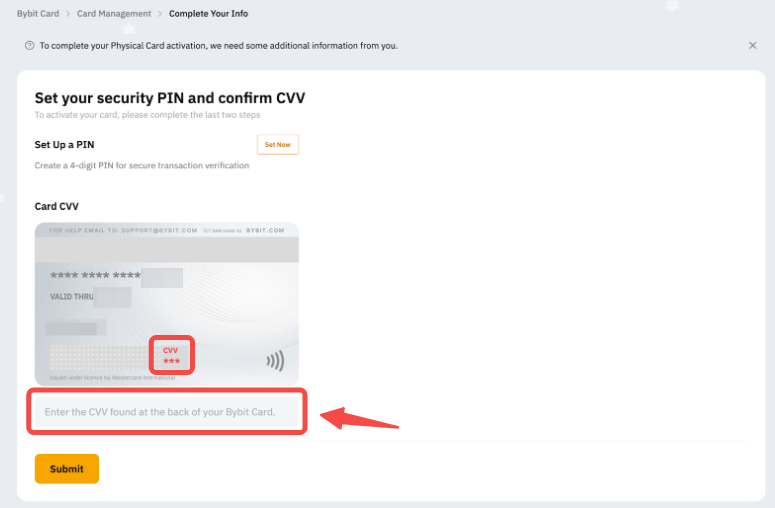 Step 4: Enter the 3-digit CVV on the back of your physical Bybit Card and click on Activate.