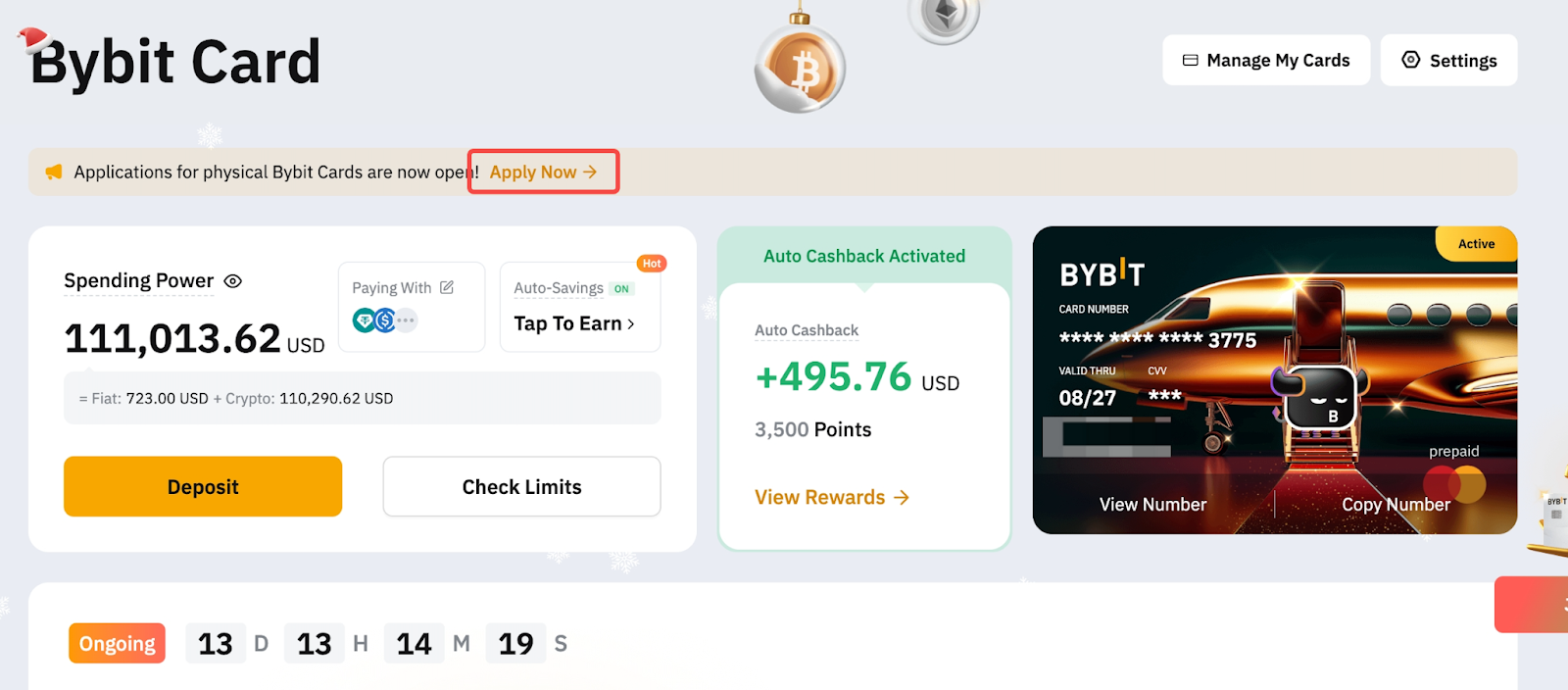 Bybit Card is a Mastercard prepaid card that enables easy and secure access to your fiat and digital funds for spending on the go. We offer a virtual Bybit Card for you to make online payments as well as a physical Bybit Card for you to use in-store. This article will guide you on how to apply for a Bybit Card.