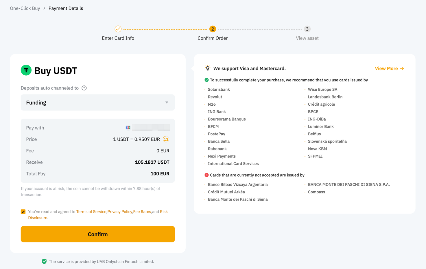 Currently, Visa and Mastercard payments are supported. Please also complete identity verification before purchasing coins. To learn more about KYC requirements, please refer to FAQ — Bank Payments.