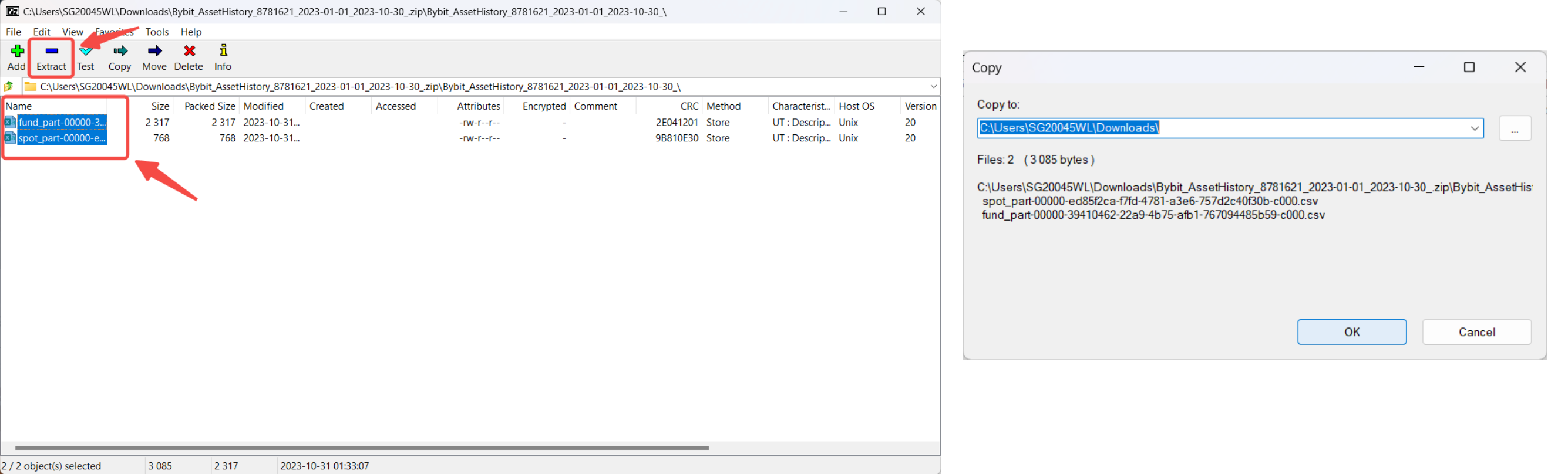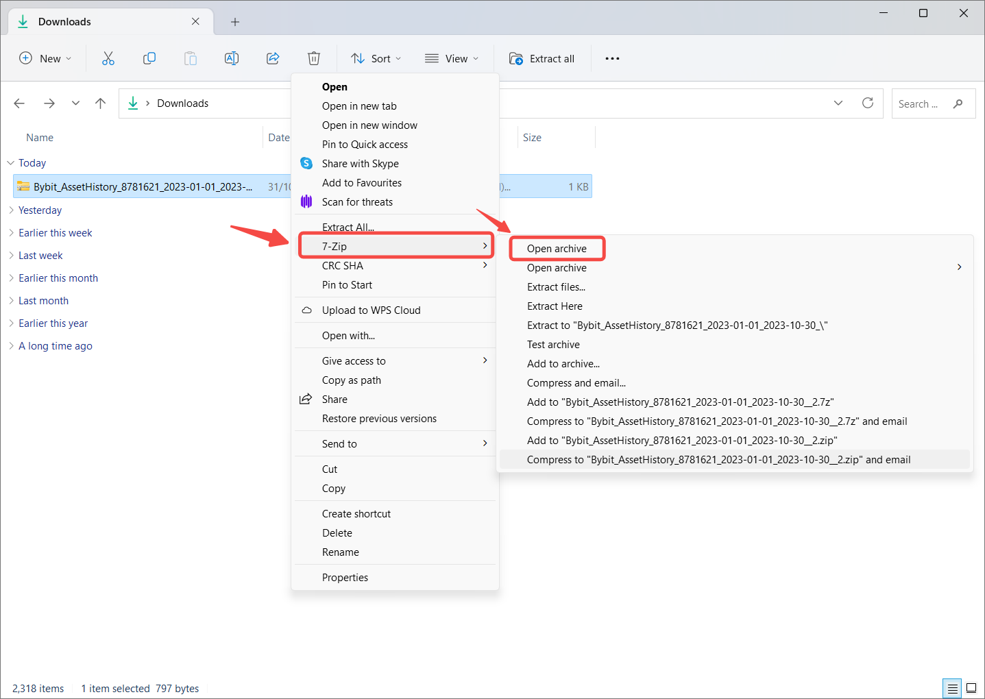 Step 1: Download the data export file from your Bybit Georgia account and open the folder containing the file. Right-click on the file and select Show more options → 7-Zip → Open archive.