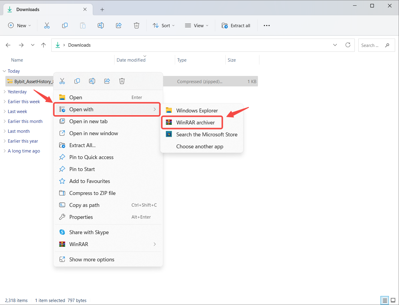 Step 1: Download the data export file from your Bybit Georgia account and open the folder containing the file. Right-click on the file and select Open with → WinRAR archiver.