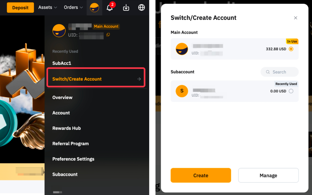 To navigate between your accounts, simply hover your cursor over your profile icon and click on the account you would like to go to or click on Switch/Create Account to access the Subaccount functions (Account Switch, Subaccount Management and Subaccount Creation) from the pop-up window displayed.