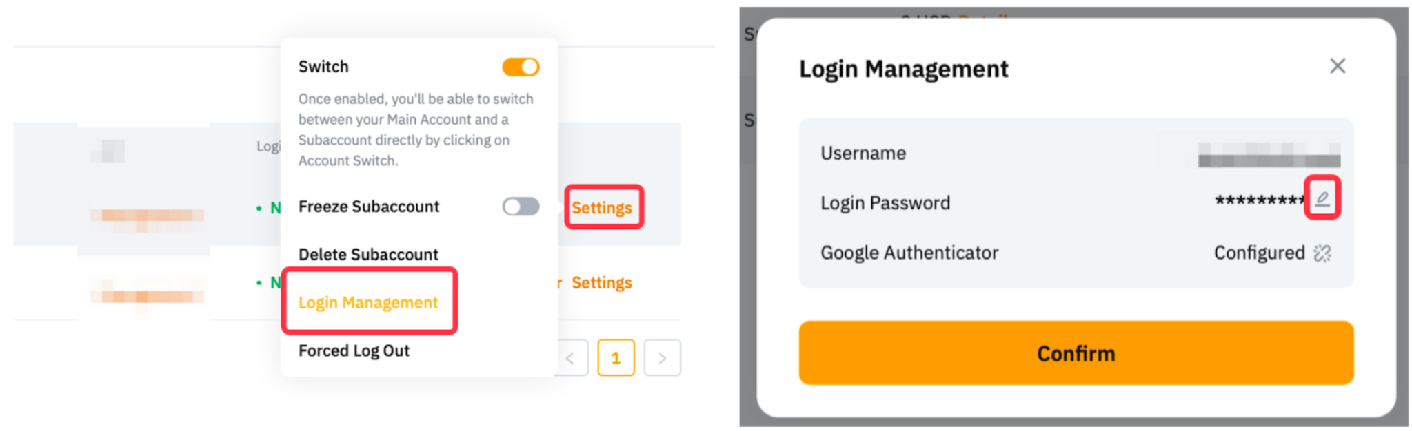 As for the password update, simply go to Settings → Login Management and click on the pencil icon under your subaccount’s username. You will then be requested to indicate your new password and to confirm the update by entering your main account’s 2FA verification code.