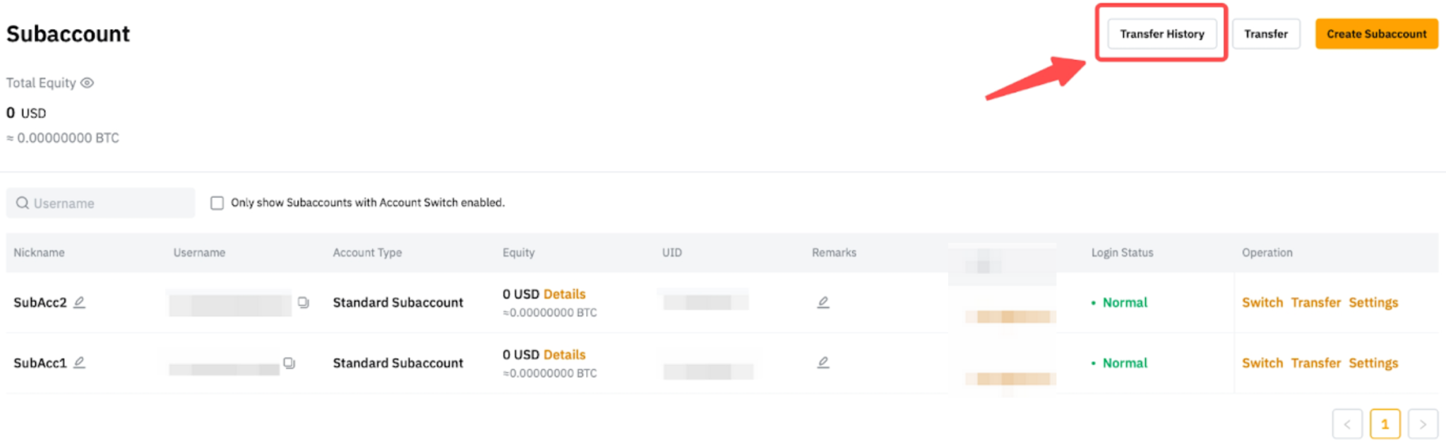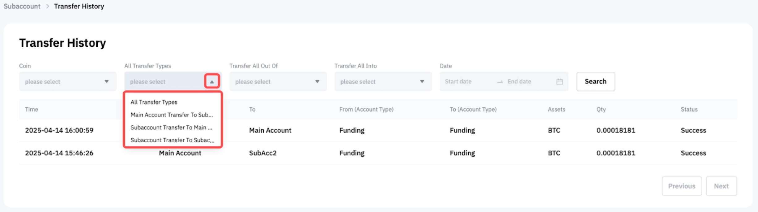 On the Transfer History page, you can select the transfer types that you would like to see more precisely, such as transfers from your Main Account to a Subaccount, from a Subaccount to your Main Account, or between two Subaccounts.