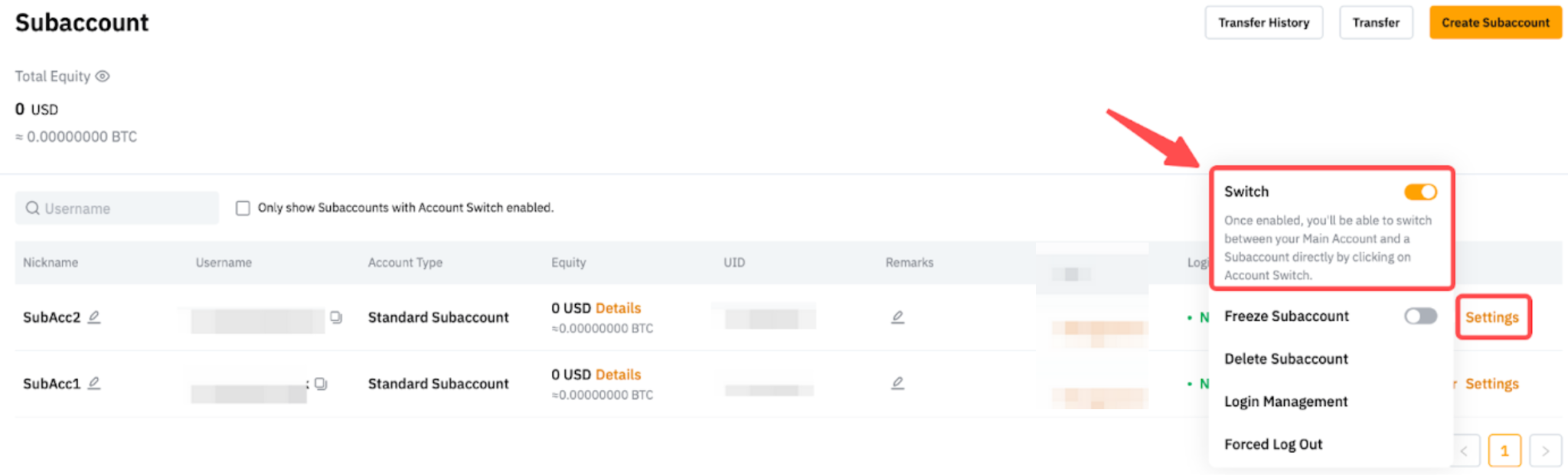 Once it is enabled, you can also click on the Account Switch button of the account to log in to the chosen subaccount.