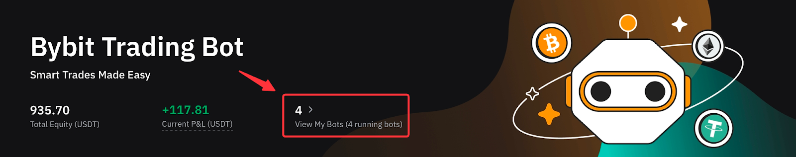 If you've previously created Bybit Georgia trading bots, such as Spot Grid Bot and/or DCA Bot, you can view the Total Equity (USD) and Unrealized P&L (USD) under My Bots in the upper left corner of the Bybit Georgia Trading Bot page.