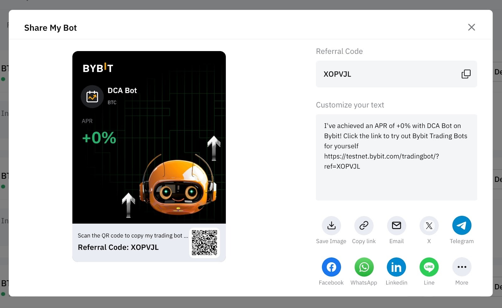 Step 1: Please click on View My Bots under the Bybit Georgia Trading Bot to enter the My Bots page. Then, click on the Share icon in the upper right corner of the DCA bot column to share.