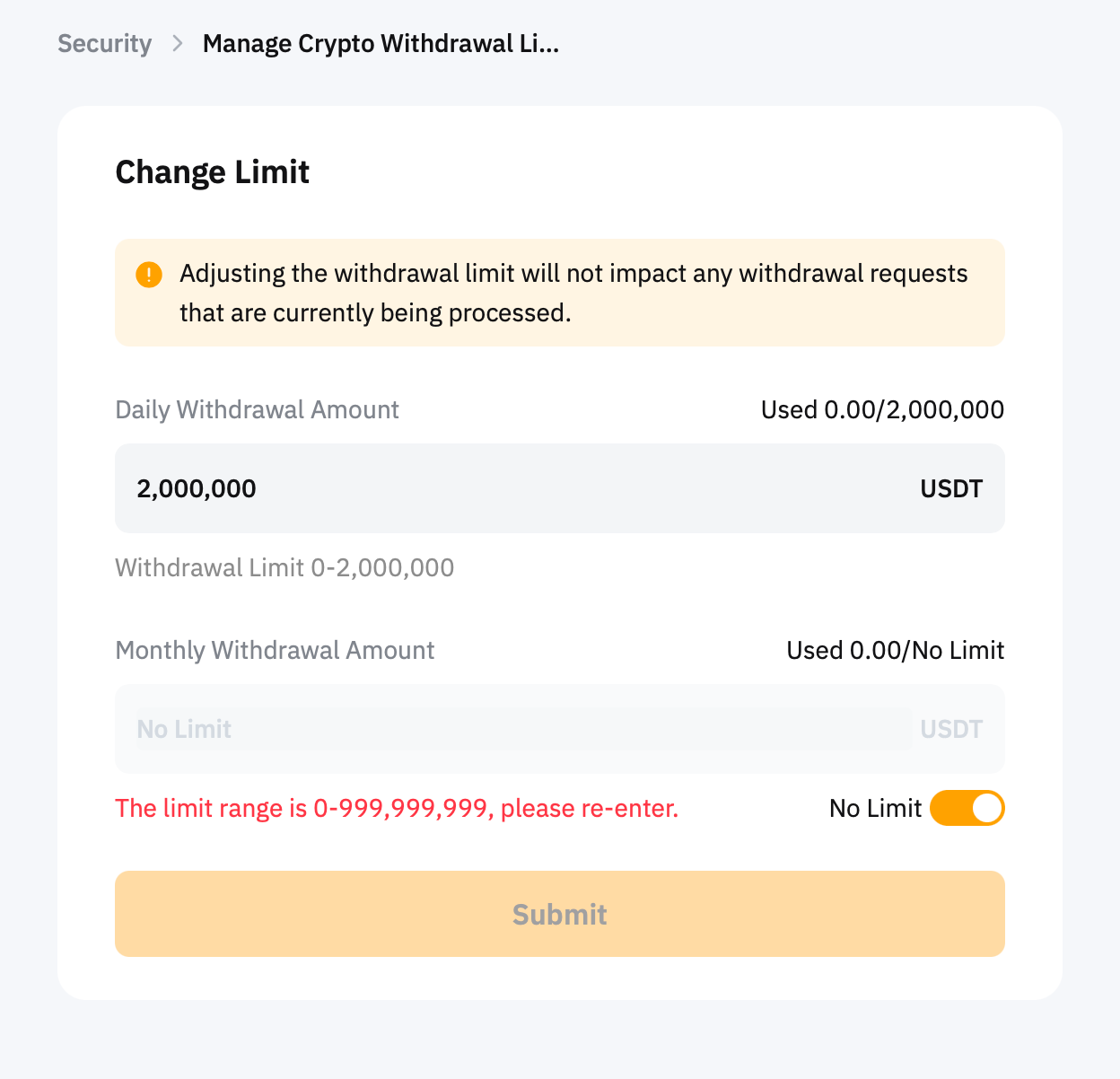 — Changing your withdrawal limits will not impact your current withdrawal requests and will only be effective from the next withdrawal requests.