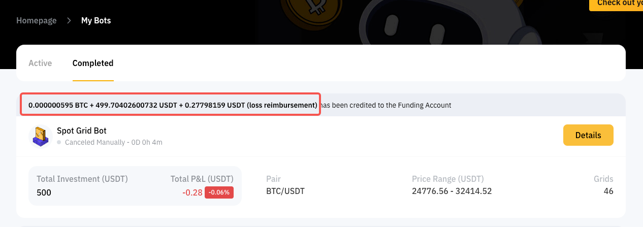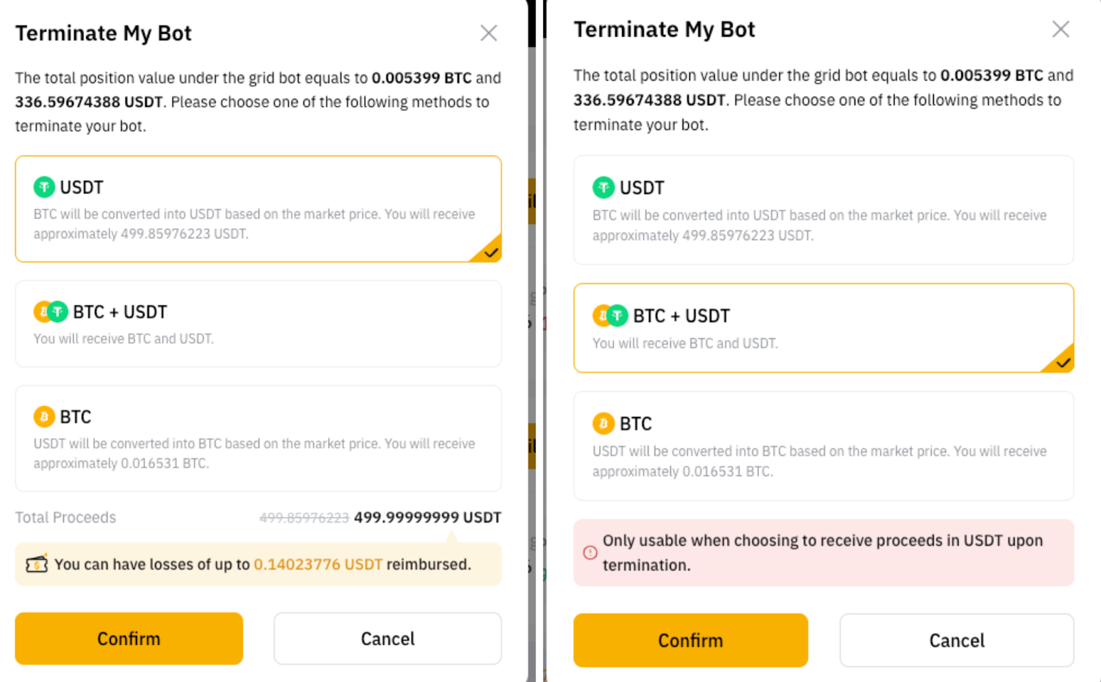 Step 4: When you terminate your bot, the system will automatically use any available voucher to cover your losses. However, ensure that the coin type for bot settlement matches the voucher's designated coin type to utilize the Loss Cover Voucher.