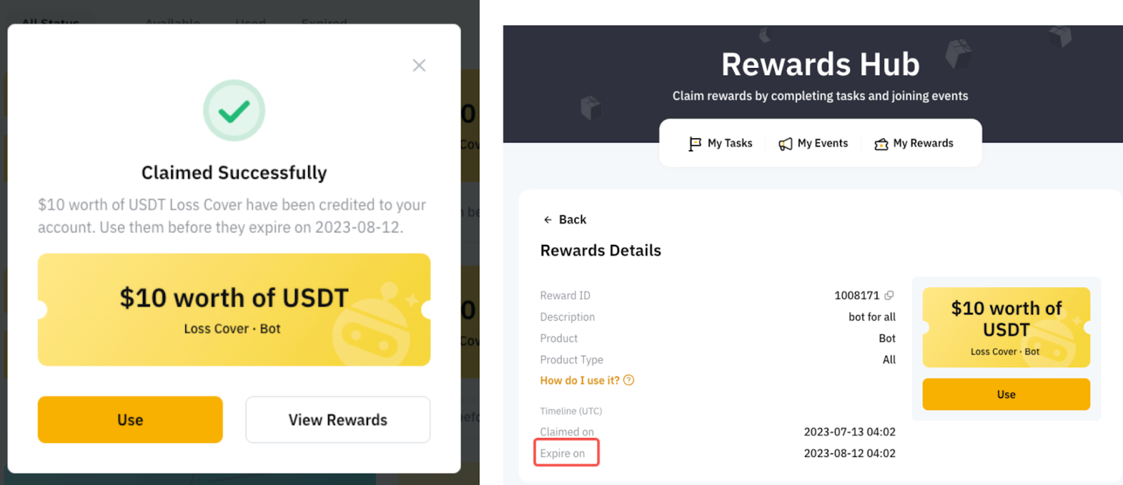 Step 2: Once you have successfully claimed your voucher, you can click on View Rewards to review the details. If you wish to use it immediately, click on Use. This will redirect you to the Trading Bot page where you can create a bot.