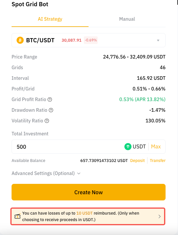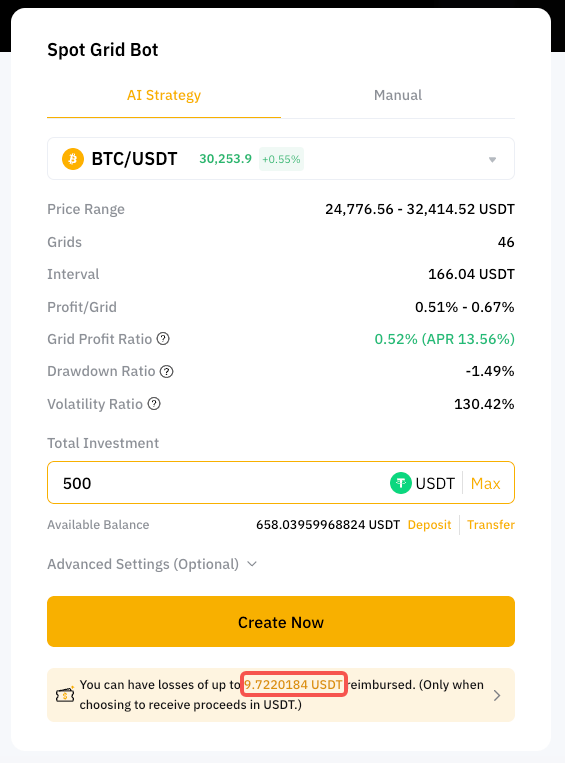 Step 3: During the bot creation process, you'll be able to see the amount of your Loss Cover Voucher. Do note that the voucher only comes into effect upon the termination of the bot. Therefore, you will still need sufficient funds to operate your bot initially.