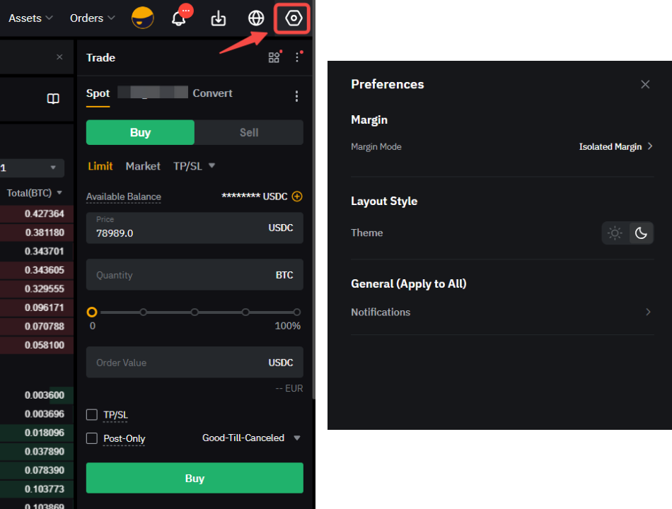 The Settings in the trading pages will offer more options for your trading activities. To access the Settings menu, simply click on the Settings icon on the top right corner of the page.