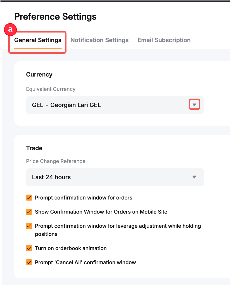 Select your preferred currency for display on the Bybit Georgia website in the General Settings tab. This currency will be used to give you an estimate of your funds and order amounts to better grasp the value in your account.