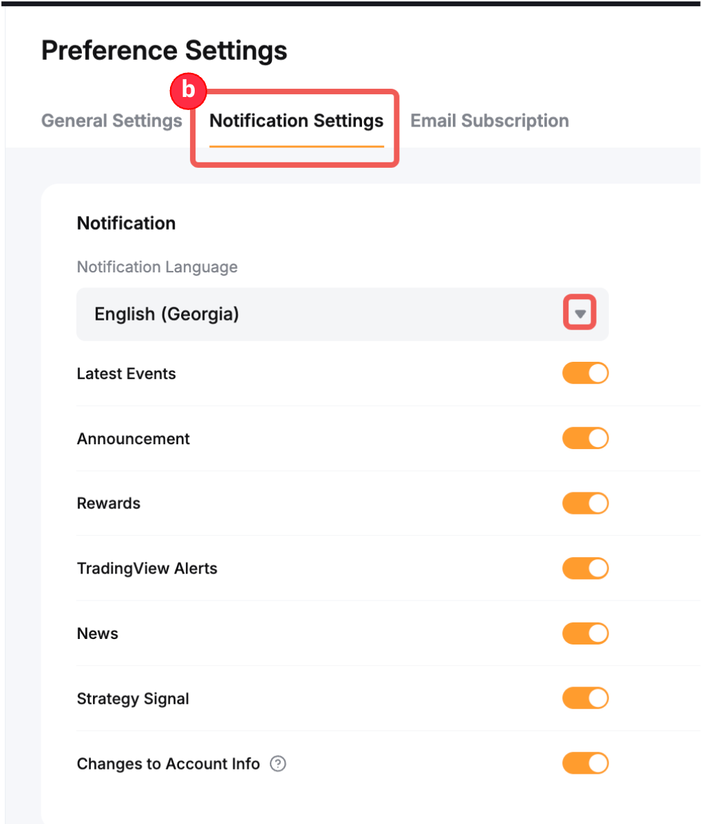 Select your preferred notification language inside the drop-down menu in the Notification Settings tab. Please note that this language setting only applies to the email notifications you receive. To modify the language of the website or pop-up notifications, please refer to this guide.