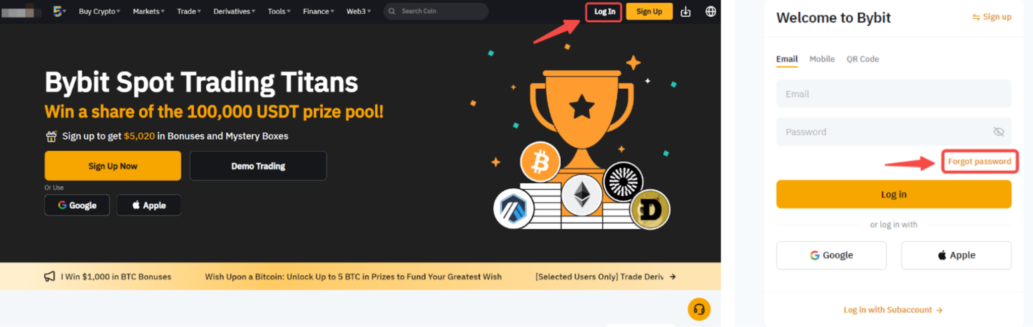 Step 1: On Bybit Georgia Homepage, click on Log In. Once on the login page, tap on Forgot Password.