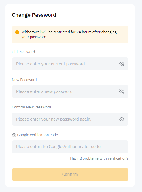 Enter your old password, the new one as well as your Google verification code and click on Confirm so your password reset will be effective. As a security measure, you will be logged out of your account and will need to use your new password to login again.