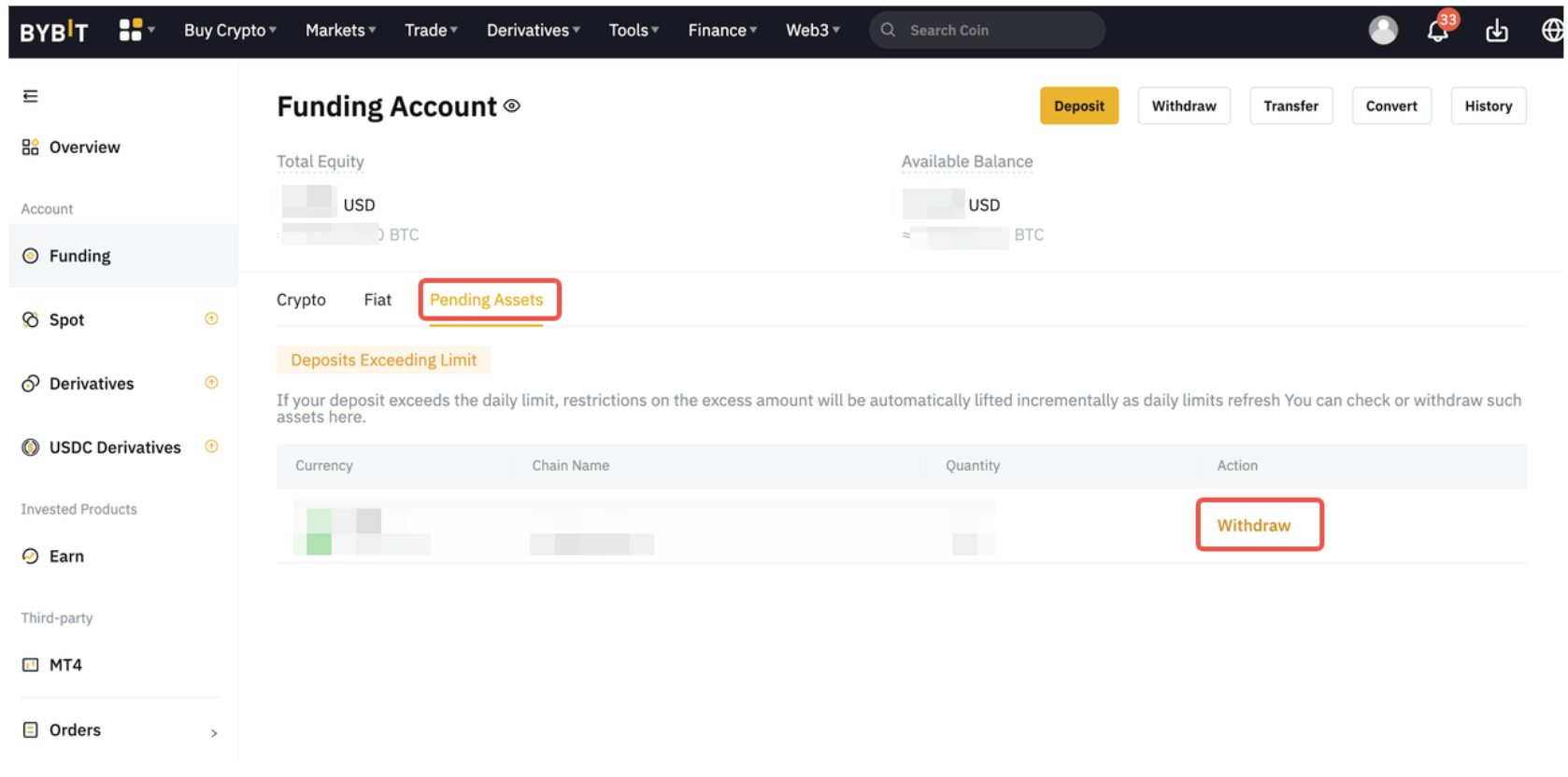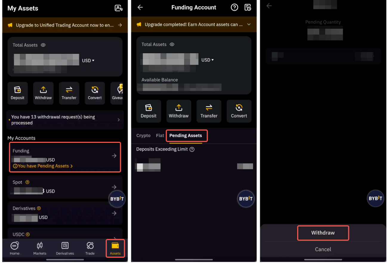 Bybit has established a daily deposit credit limit for each particular blockchain. Deposits exceeding this limit will temporarily remain as non-tradable assets and can be viewed in the Pending Assets section on the Funding Account Page.
