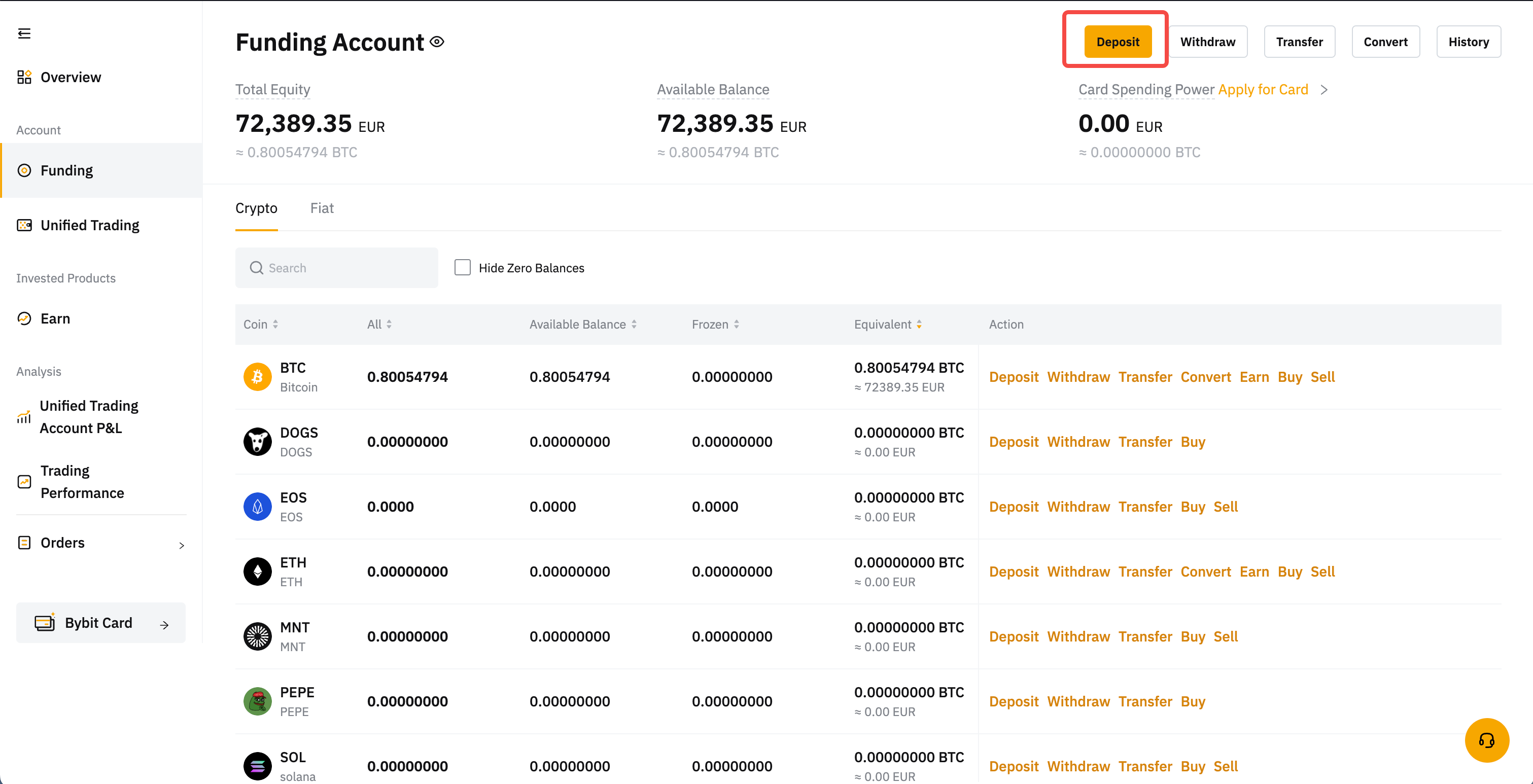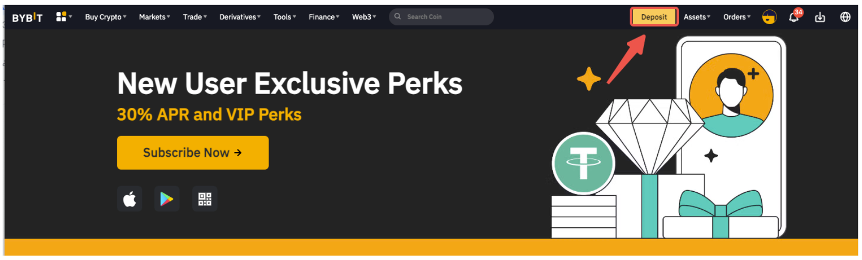 Alternatively, you can also locate the Deposit entrance in the upper right corner of the Bybit page.