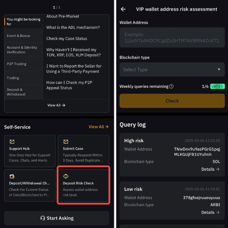 Yes, currently only VIP users can access the address risk feature via a self-service bot and the deposit page. Users can click on Verify deposit source address risk to access the page.