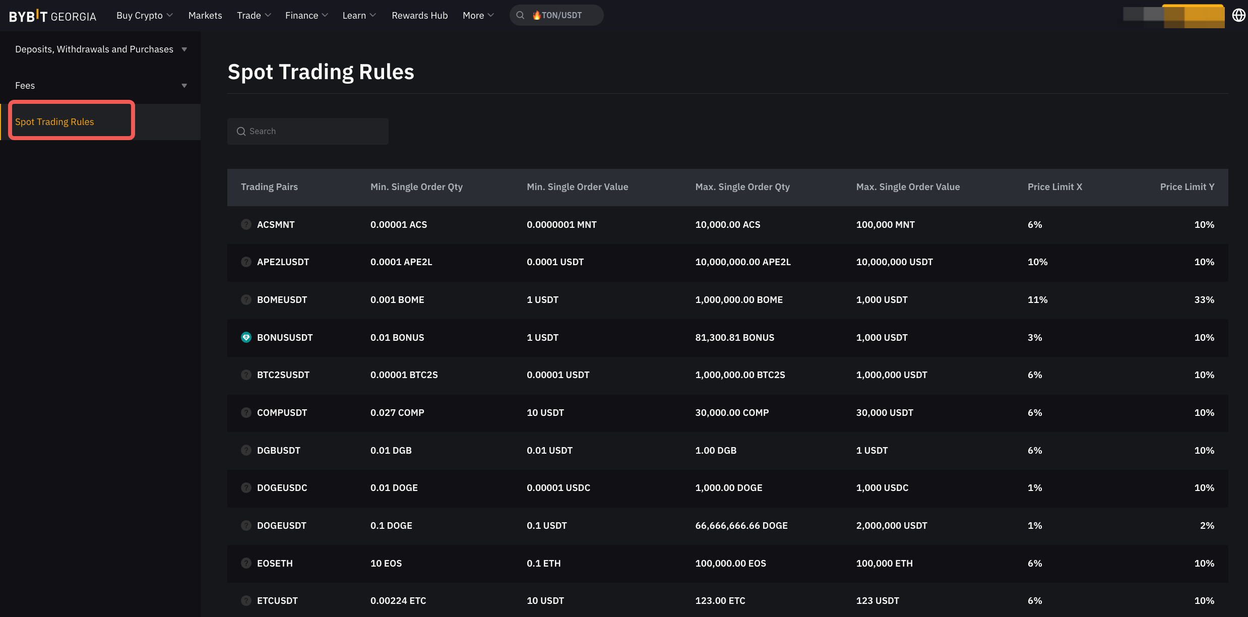 Bybit Georgia-მა დააწესა მინიმალური და მაქსიმალური ლიმიტები როგორც ერთჯერადი შეკვეთების რაოდენობის, ასევე ღირებულებისთვის. კერძოდ, შეკვეთის ღირებულება უნდა აკმაყოფილებდეს მინიმალურ დადგენილ მოთხოვნებს, ხოლო შეკვეთის ღირებულება და რაოდენობა არ უნდა აღემატებოდეს მაქსიმალურ ლიმიტებს. მაგალითად, ერთი BTC/USDT შეკვეთა უნდა აკმაყოფილებდეს შემდეგ პირობებს: შეკვეთის მინიმალური ღირებულებაა 1 USDT; შეკვეთის მაქსიმალური ღირებულებაა 8,000,000 USDT, ხოლო შეკვეთის მაქსიმალური რაოდენობაა 71.73 BTC.