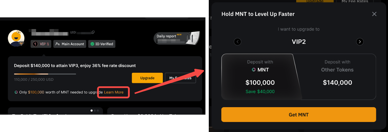 თქვენს MNT აქტივებზე გამოიყენება 1.5x მულტიპლიკატორი, რაც MNT-ის ღირებულებას 97,500 აშშ დოლარამდე (65,000 აშშ დოლარი × 1.5) ზრდის. 30,000 USDT-ის დამატებით თქვენი აქტივების საერთო ღირებულება 127,500 აშშ დოლარამდე იზრდება, რაც VIP 1 კლასში მოხვედრის საშუალებას გაძლევთ.