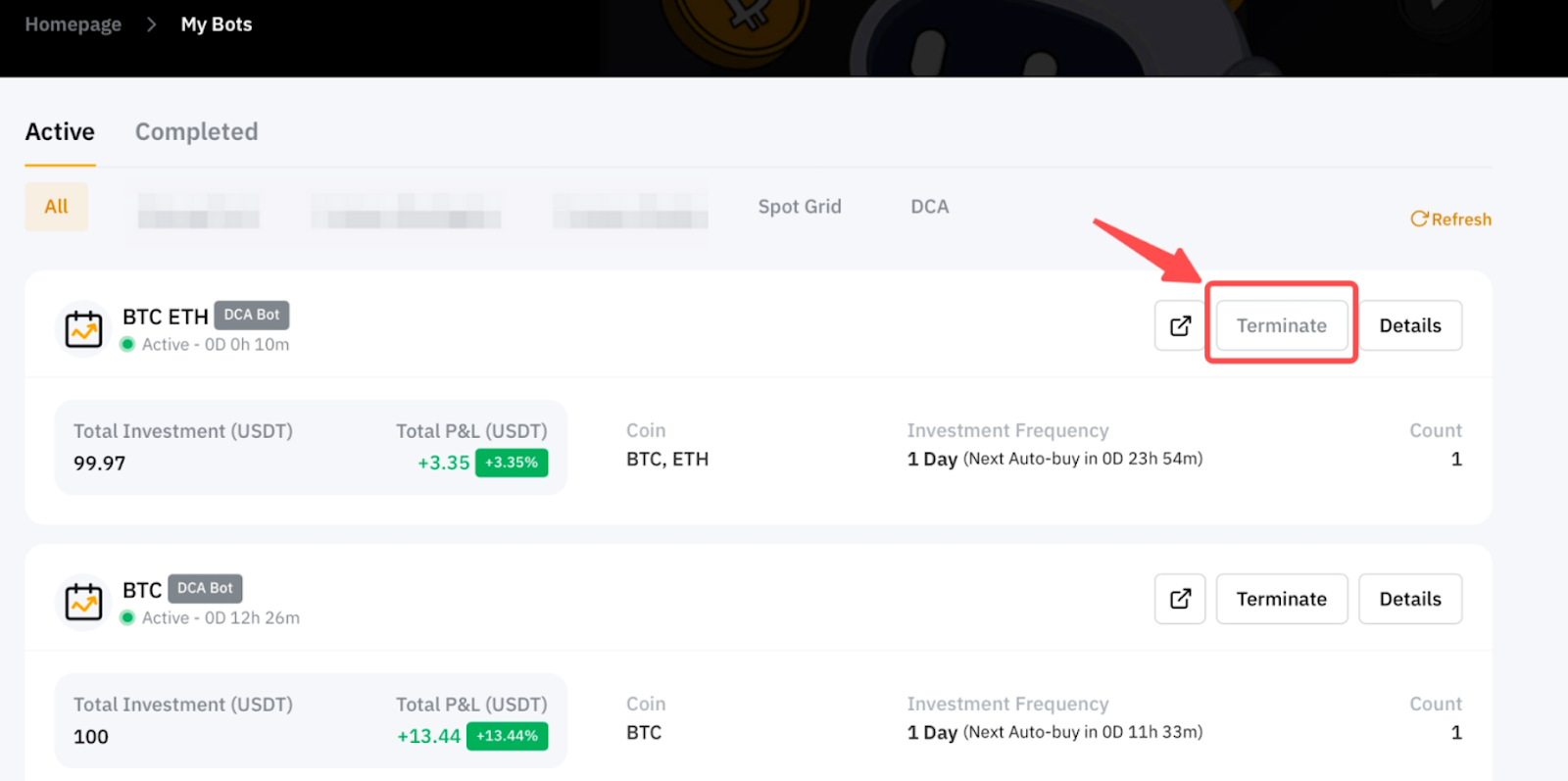 ნაბიჯი 2: დასახურად დააწკაპუნეთ შეწყვეტას DCA ბოტის სვეტის ზედა მარჯვენა კუთხეში.