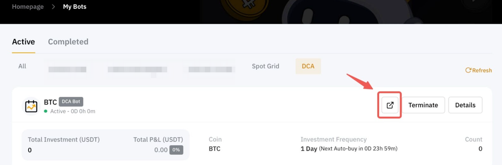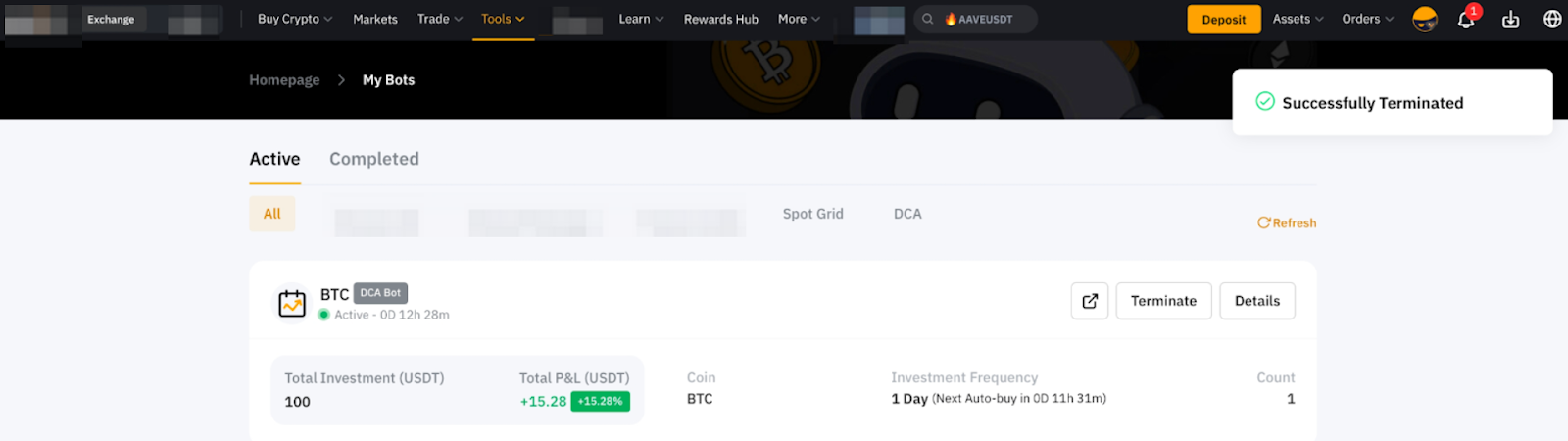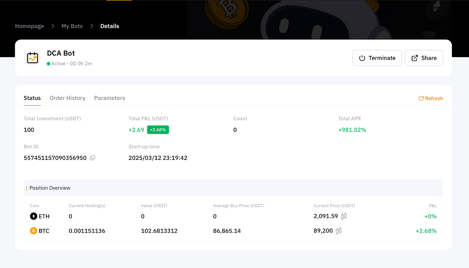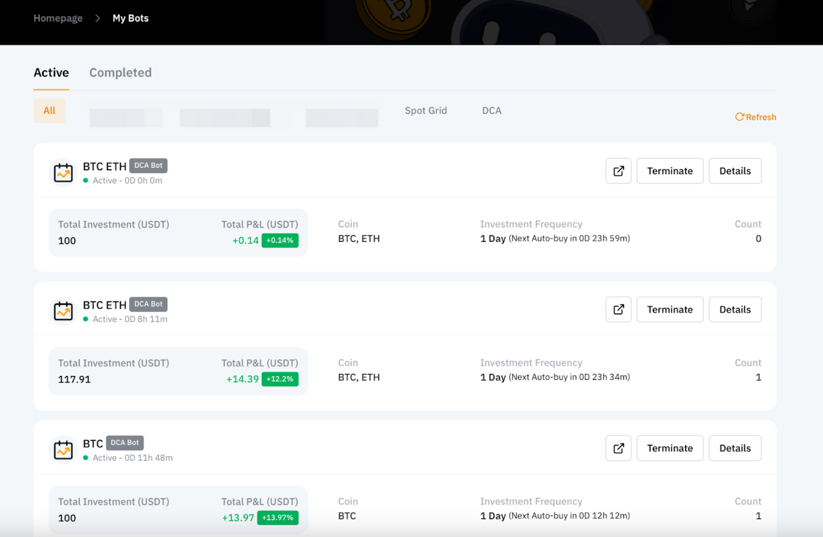 მას შემდეგ, რაც დააწკაპუნებთ დადასტურება, გვერდი ავტომატურად გადამისამართდება ჩემი ბოტების გვერდზე რომ ნახოთ თქვენი აქტიური DCA ბოტები.