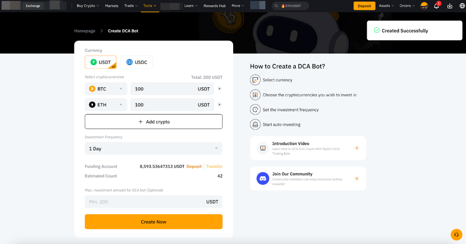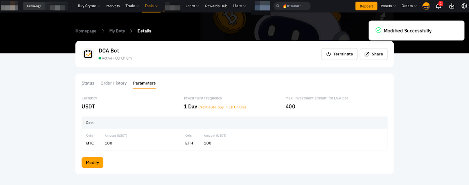 გთხოვთ გაითვალისწინოთ, რომ თქვენი პირველი DCA ინვესტიცია იწყება DCA ბოტის წარმატებით შექმნის შემდეგ.