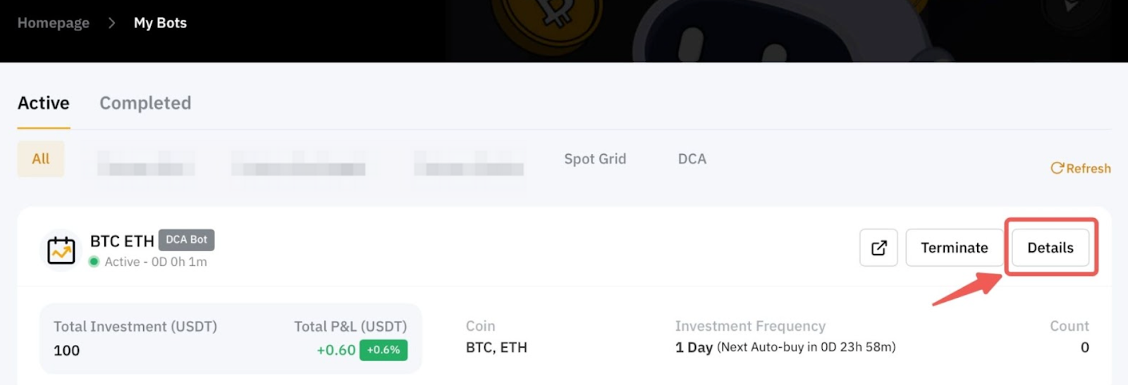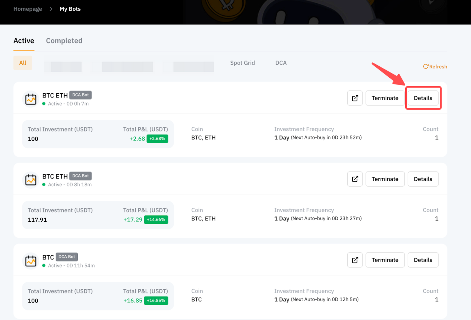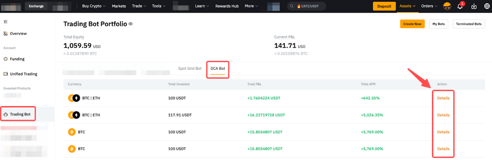 შეგიძლიათ დააწკაპუნოთ დეტალები DCA ბოტის ზედა მარჯვენა კუთხეში, რომლის ნახვაც გსურთ, მეტი ინფორმაციის მისაღებად, მათ შორის პოზიციის მიმოხილვა, სულ წლიური საპროცენტო განაკვეთი, საშ. ფასი, შესრულებული რაოდენობა და მეტი.