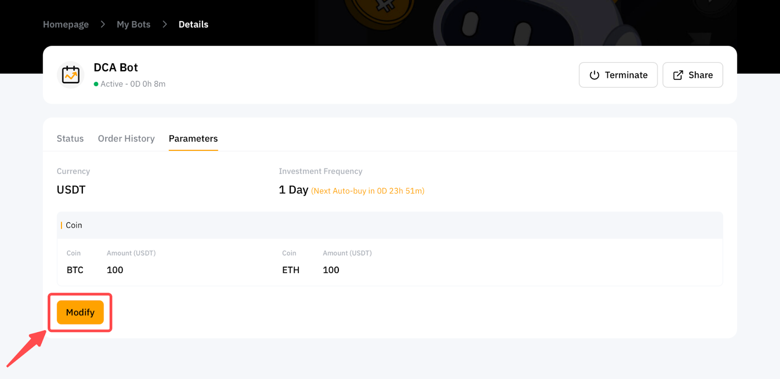ნაბიჯი 1: დააწკაპუნეთ ჩემი ბოტების ნახვას Bybit Georgia-ს სავაჭრო ბოტის გვერდზე ზედა მარცხენა კუთხეში. შემდეგ დააწკაპუნეთ დეტალები DCA ბოტის ზედა მარჯვენა კუთხეში, რომლის პარამეტრების შეცვლაც გსურთ.