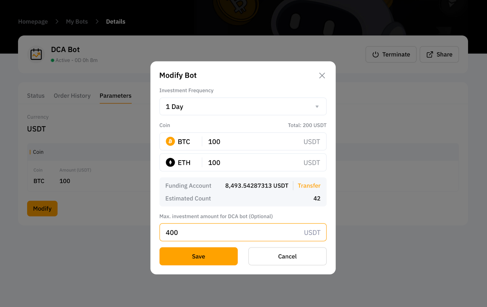 - *თუ ინვესტიციის მთლიანი თანხა მაქსიმალურ ინვესტიციის ოდენობას მიაღწევს, DCA ბოტი ავტომატურად შეწყდება და ყველა აქტივი თქვენს დაფინანსების ანგარიშზე გადაირიცხება.