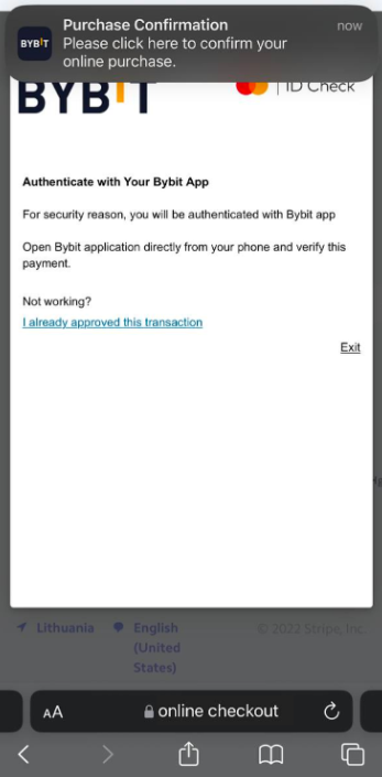 ნაბიჯი 3: განაგრძეთ გადახდის განხორციელება. გამყიდველის მიხედვით, შესაძლოა, ტრანზაქციის ავტორიზაციის ჩატარება დაგჭირდეთ. თქვენ მოგეთხოვებათ ავტორიზაციის გავლა Bybit Georgia აპლიკაციის მეშვეობით. გაითვალისწინეთ, რომ Bybit Georgia აპლიკაციისთვის შეტყობინებების ჩართვა მოგიწევთ.