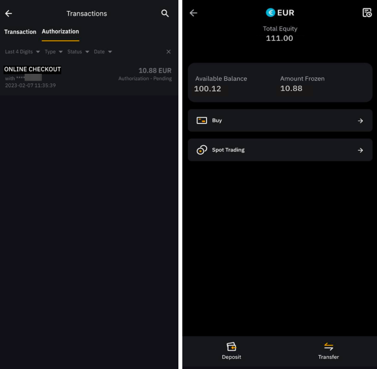 თუ გადახდა წარმატებით განხორციელდება, თანხა გაიყინება თქვენს ფინანსირების ანგარიშზე და ტრანზაქცია იქნება მოლოდინის რეჟიმში მანამ, სანამ ვაჭარი არ დაასრულებს ტრანზაქციას. ტრანზაქციის ავტორიზაციის დასრულებას, როგორც წესი, ერთი დღე ან 30 დღემდე სჭირდება. ტრანზაქციის დასრულების შემდეგ, გადახდისთვის საჭირო თანხა ჩამოიჭრება გაყინული თანხიდან.