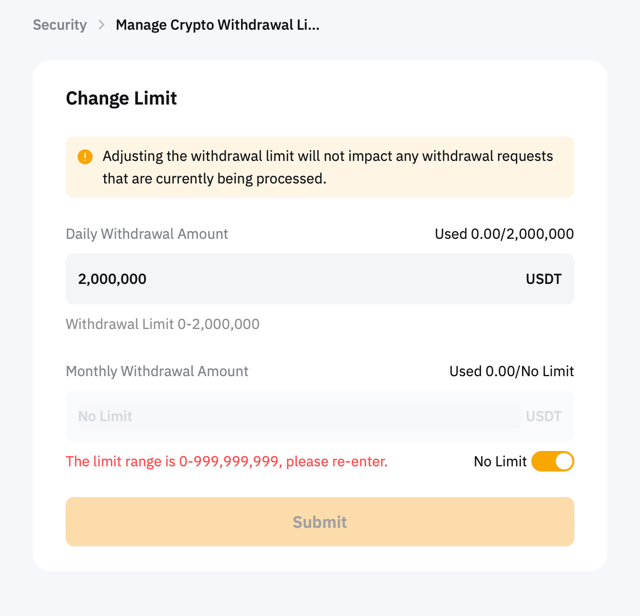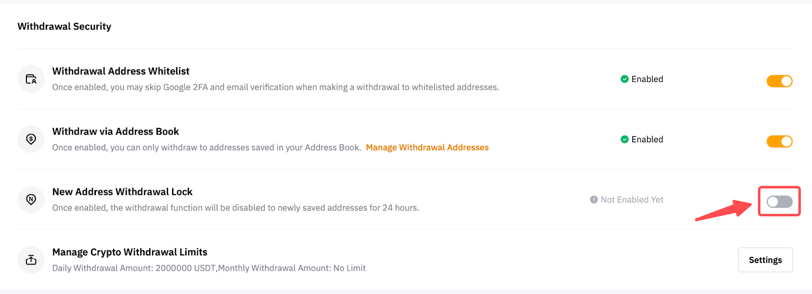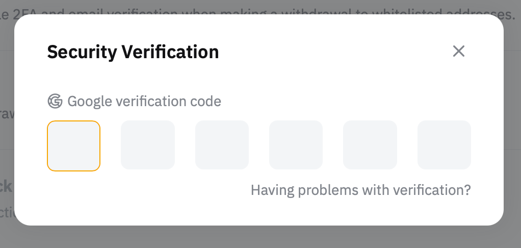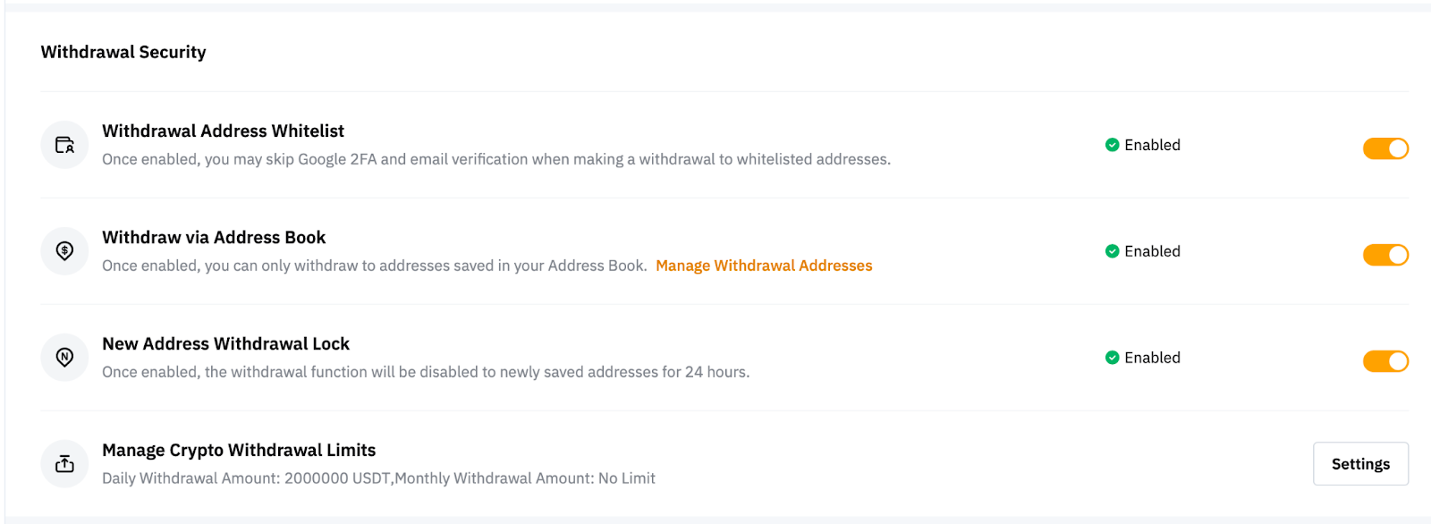 — როგორც ელექტრონული ფოსტის დამადასტურებელი კოდი, ასევე 2FA დამადასტურებელი კოდი სავალდებულო დარჩება ყველა დაუდასტურებელი განაღდების საფულის მისამართისთვის. ეს მისამართები ასევე მოგეთხოვებათ დადასტურებული საფულის მისამართებისთვის, როდესაც გატანის მისამართის თეთრი სიის ფუნქცია გამორთულია.