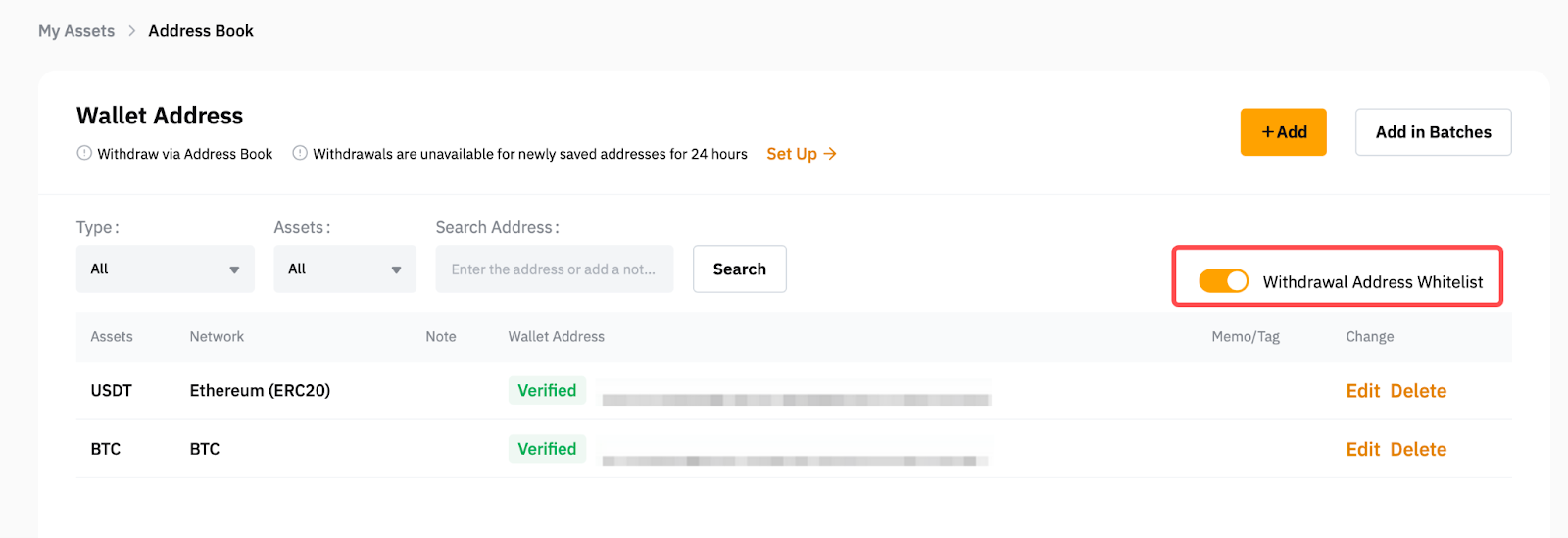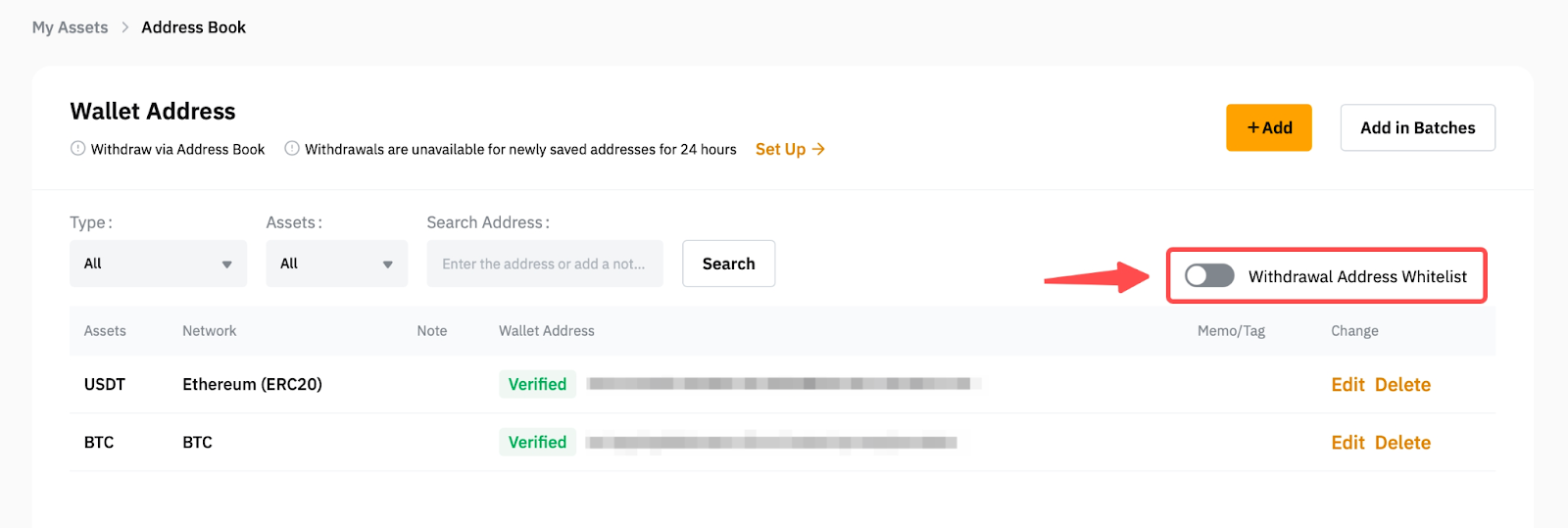 გატანის მისამართის თეთრი სიის ფუნქცია ტრეიდერებს საშუალებას აძლევს, გადაამოწმონ თავიანთი თანხის გატანის საფულის მისამართები. ეს იმისთვის კეთდება, რომ Bybit Georgia-ზე თანხის გატანის მოთხოვნების შესრულებისას ელექტრონული ფოსტის დამადასტურებელი კოდი და 2FA დამადასტურებელი კოდი აღარ იყოს საჭირო.