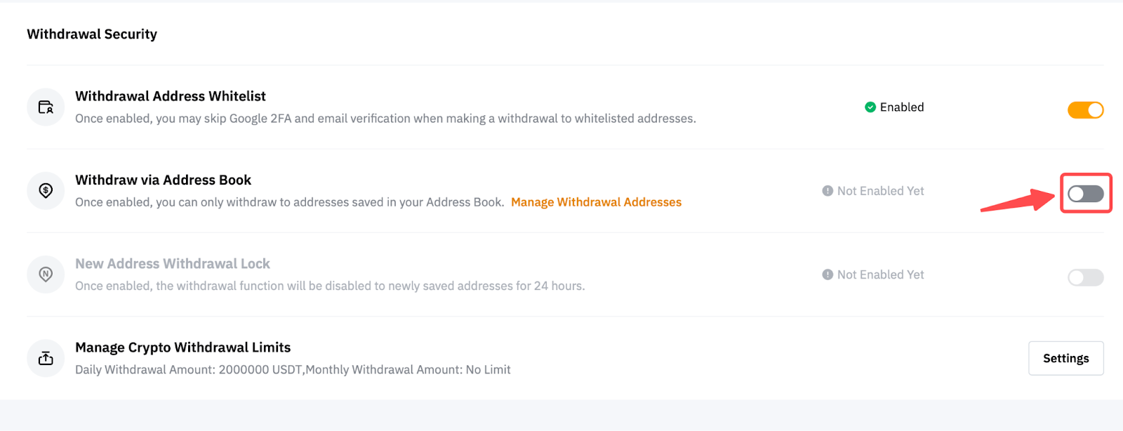 გატანა მისამართების წიგნის გამოყენებით ფუნქცია უზრუნველყოფს, რომ თანხის გატანის მოთხოვნის განსათავსებლად გამოყენებული იქნას მხოლოდ თქვენს გატანის მისამართი წიგნში რეგისტრირებული მისამართები. ამიტომ, ტრეიდერები ვერ შეძლებენ ახალი საფულის მისამართის შეყვანას თანხის გატანის ფანჯრის შევსების შემდეგ.