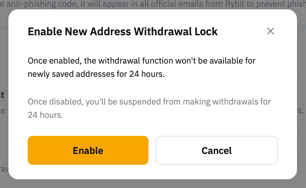 Bybit Georgia-ზე გატანის მისამართი წიგნს დაემატა დამატებითი უსაფრთხოების ფუნქციები, რათა ტრეიდერებისთვის თანხის გატანის პროცესი გამარტივებინათ და ამავდროულად, უზრუნველყოფილიყო მათი ანგარიშის თანხის გატანის ფუნქციების უსაფრთხოება.