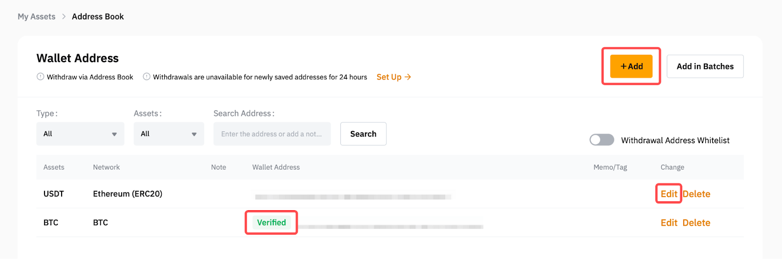ნაბიჯი 2: ახალი საფულის მისამართის დასამატებლად, გთხოვთ, დააჭიროთ გვერდის ზედა მარჯვენა კუთხეში „დამატებას“ ან აირჩიოთ საფულის მისამართი, რომლის დადასტურებაც გსურთ „შესწორება“დაწკაპუნებით.
