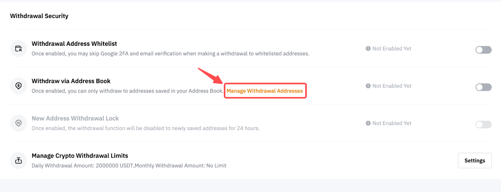 ნაბიჯი 1: დასაწყებად, გადადით მოცემულ საფულის მართვის ბმულზე აქ, ან დააწკაპუნეთ პარამეტრებზე ან განაღდების მისამართების მართვაზე ანგარიშის უსაფრთხოების გვერდი.