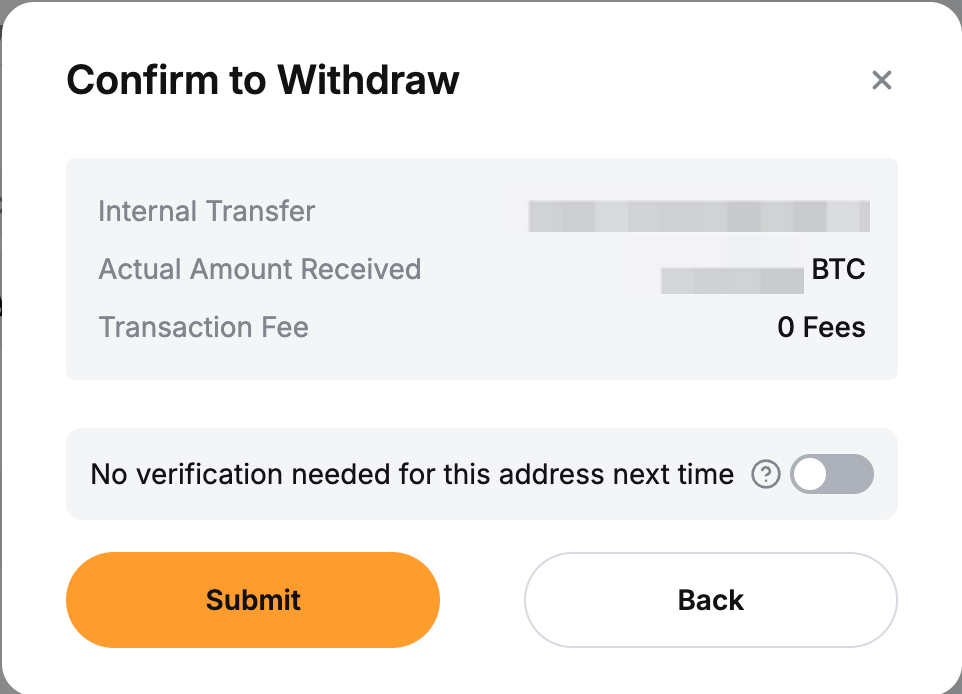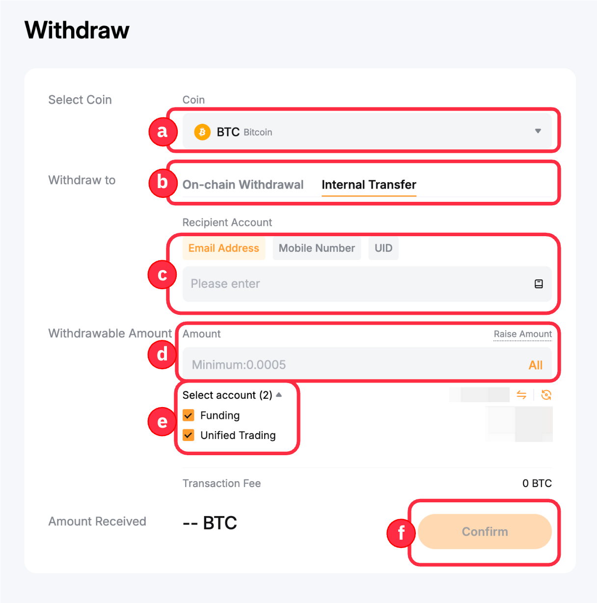 Bybit Georgia-ს შიდა გადარიცხვის მეთოდი მომხმარებლებს საშუალებას აძლევს, აქტივები Bybit Georgia-ს სხვა ანგარიშებზე მომენტალურად, გატანის საკომისიოს გარეშე, გადარიცხონ. თუ გსურთ თქვენი აქტივების სხვა ბირჟაზე ან საფულეზე გატანა, თქვენი აქტივების გატანა ონჩეინ განაღდების გამოყენებით დაგჭირდებათ. დეტალებისთვის, გთხოვთ, იხილოთ როგორ წარვადგინოთ On-Chain თანხის გატანის მოთხოვნა.